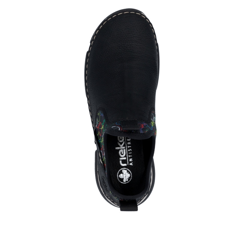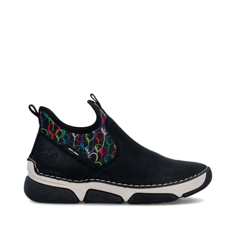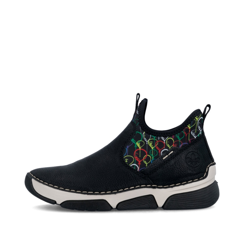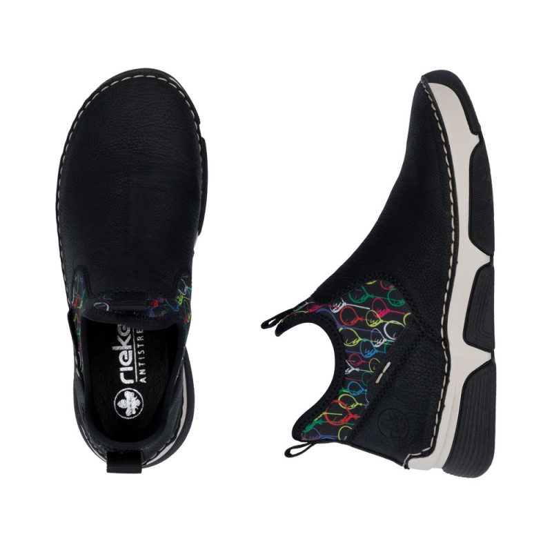 With smooth black eco leather and multi-color side prints, these Rieker women’s boots bring a fresh and dynamic vibe to any outfit.