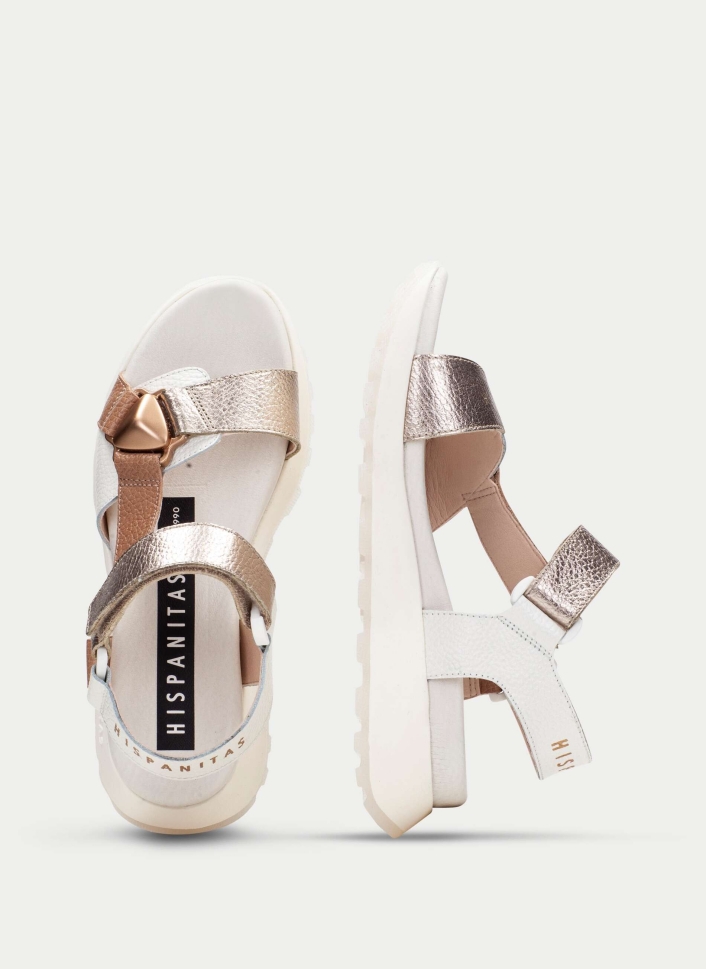 Upgrade your summer wardrobe with these sophisticated women’s white platform sandals by Hispanitas. Designed with a refined blend of white leather, warm beige accents, and metallic champagne details, this model delivers modern elegance with exceptional comfort.