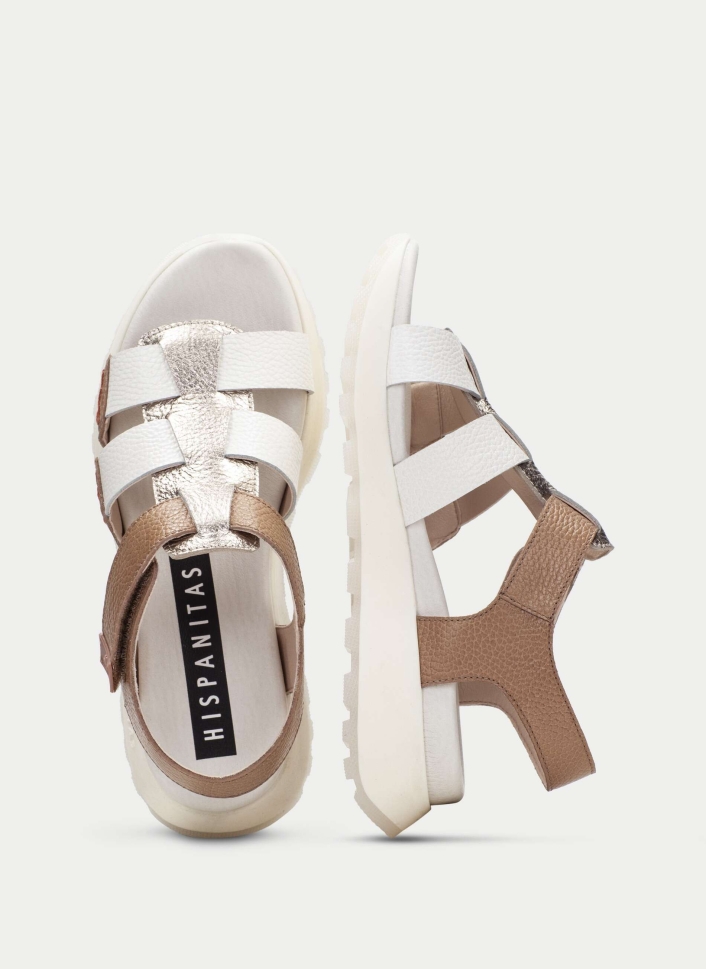 Discover effortless elegance with these contemporary women’s white platform sandals by Hispanitas. Designed with a refined mix of white leather, warm beige accents, and a subtle metallic detail, this model perfectly balances modern fashion and superior comfort.