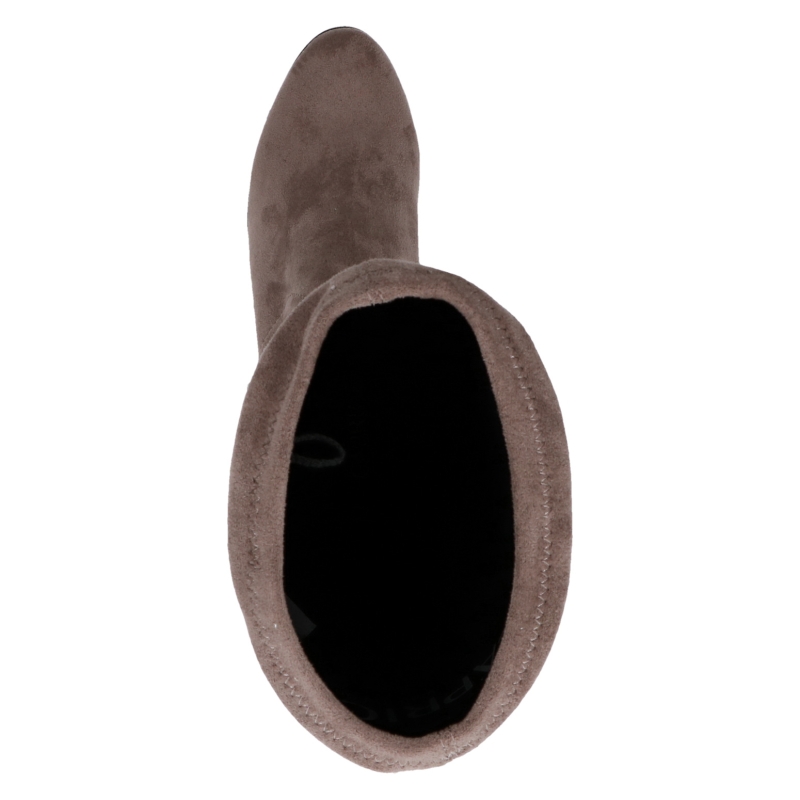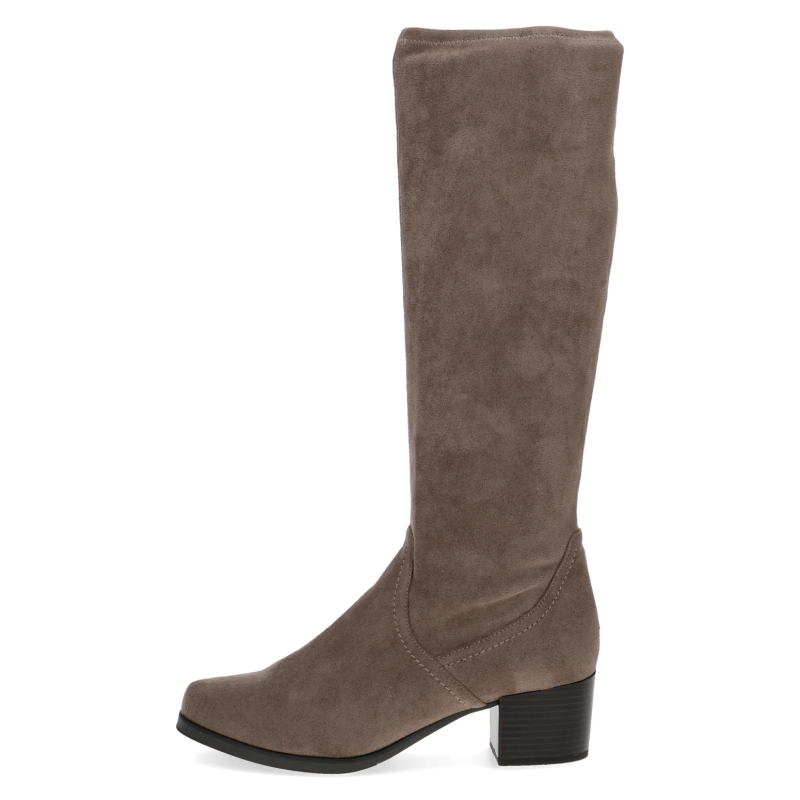 Открийте изисканата елегантност и комфорт с тези дамски ботуши Caprice от веган стреч велур в нежен таупе нюанс. Създадени за жените, които ценят етичната мода и луксозния стил, те предлагат съвършен баланс между естетика и удобство. Меката, еластична горна част приляга идеално по крака, подчертавайки изящната линия на силуета, докато стабилният ток от 5 см осигурява комфорт и стабилност през целия ден.