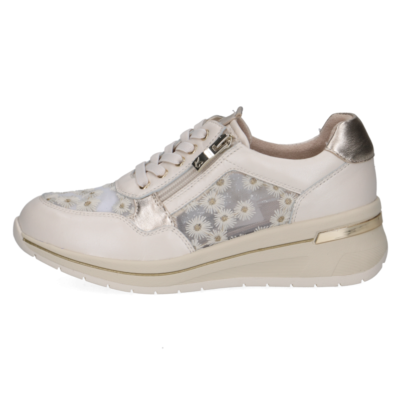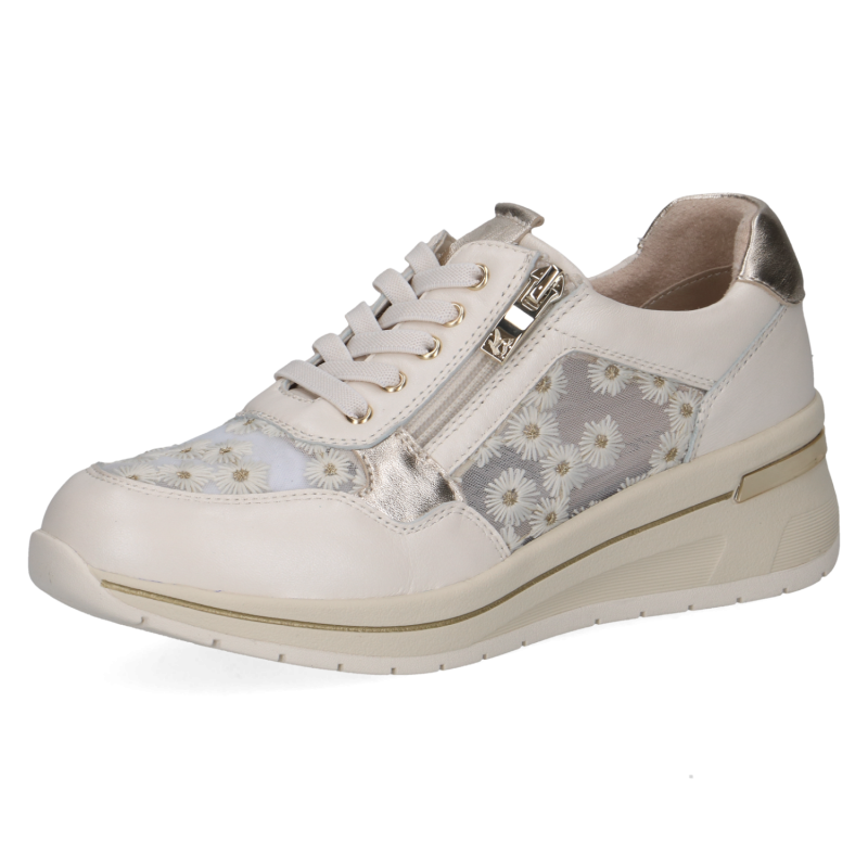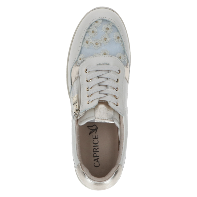 Тези бели сникърси Caprice съчетават премиум изработка и изключителен комфорт. Горната част е изработена от висококачествена естествена кожа, комбинирана с дишащ текстил с деликатен флорален мотив, който придава женствен и модерен акцент.