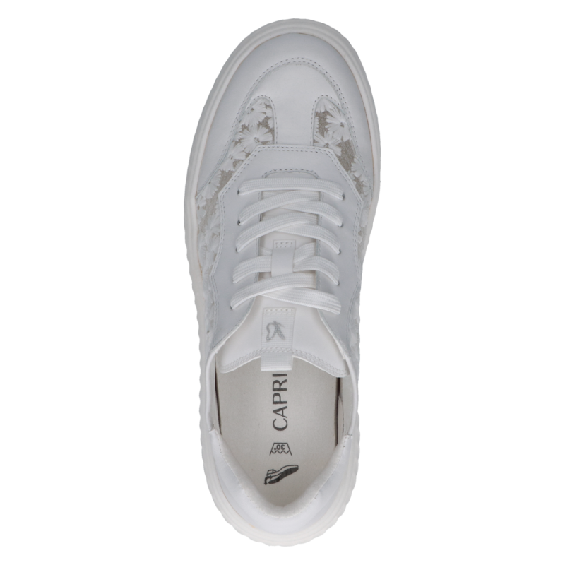Тези бели сникърси Caprice съчетават премиум изработка и изключителен комфорт. Горната част е изработена от висококачествена естествена кожа, комбинирана с дишащ текстил с деликатен флорален мотив, който придава женствен и модерен акцент.