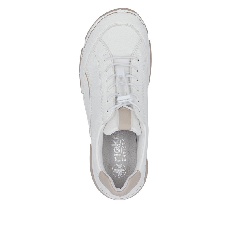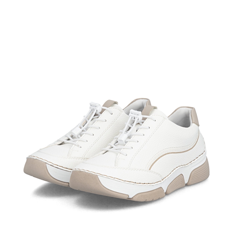 Модерни дамски сникърси, изработени от висококачествена еко кожа с фина текстура, които съчетават комфорт, стабилност и стилна визия. Нежният неутрален цвят в комбинация с бежови акценти прави модела изключително лесен за комбиниране както с ежедневни, така и със спортно-елегантни визии.