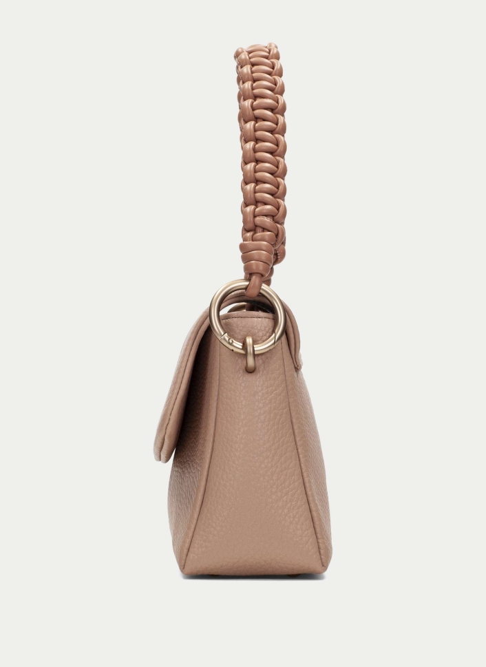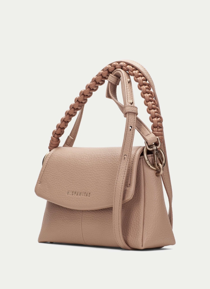 Силуетът на тази бежова дамска чанта Hispanitas е изчистен, но с характерен акцент – плетена дръжка, която придава уникалност и динамика.