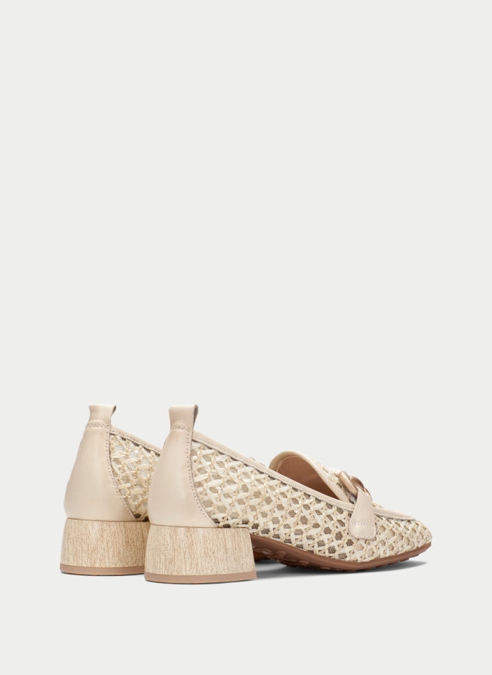 Кремави обувки Hispanitas с нисък ток от дишаща плетена текстилна структура с велурени детайли и декоративен метален акцент. Стабилен блок ток с дървесен ефект (около 4 см) осигурява комфорт през целия ден. Леки и гъвкави – идеални за пролет и лято.