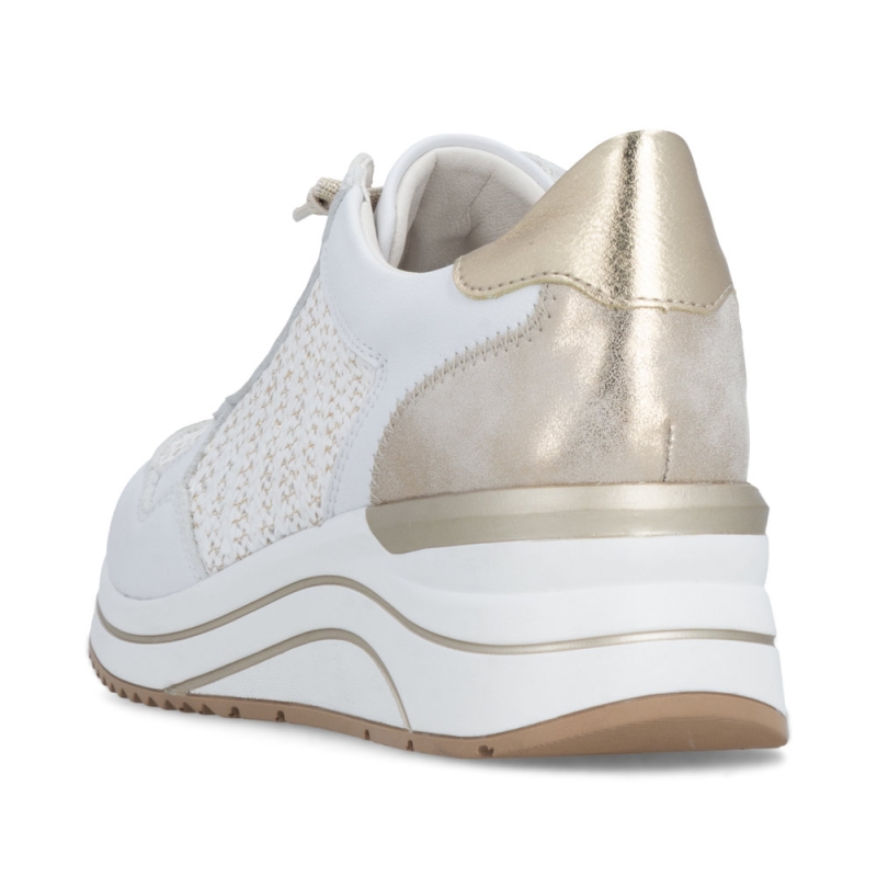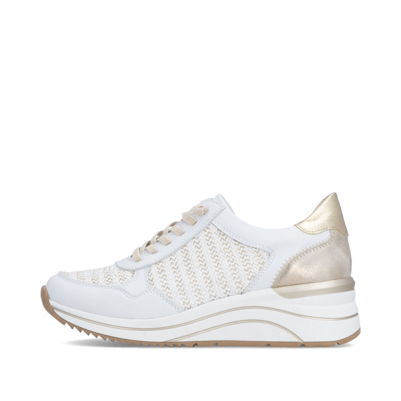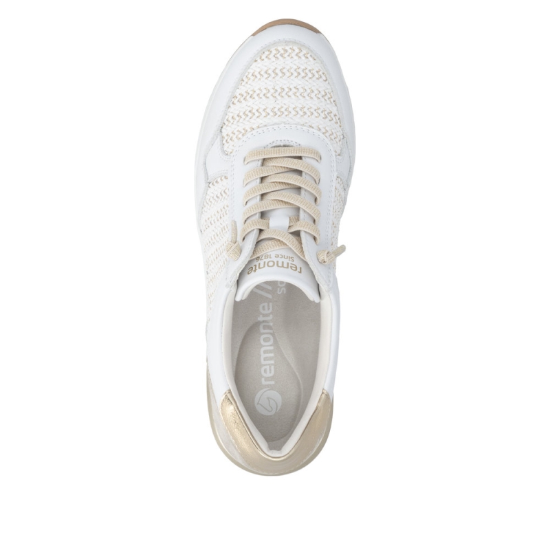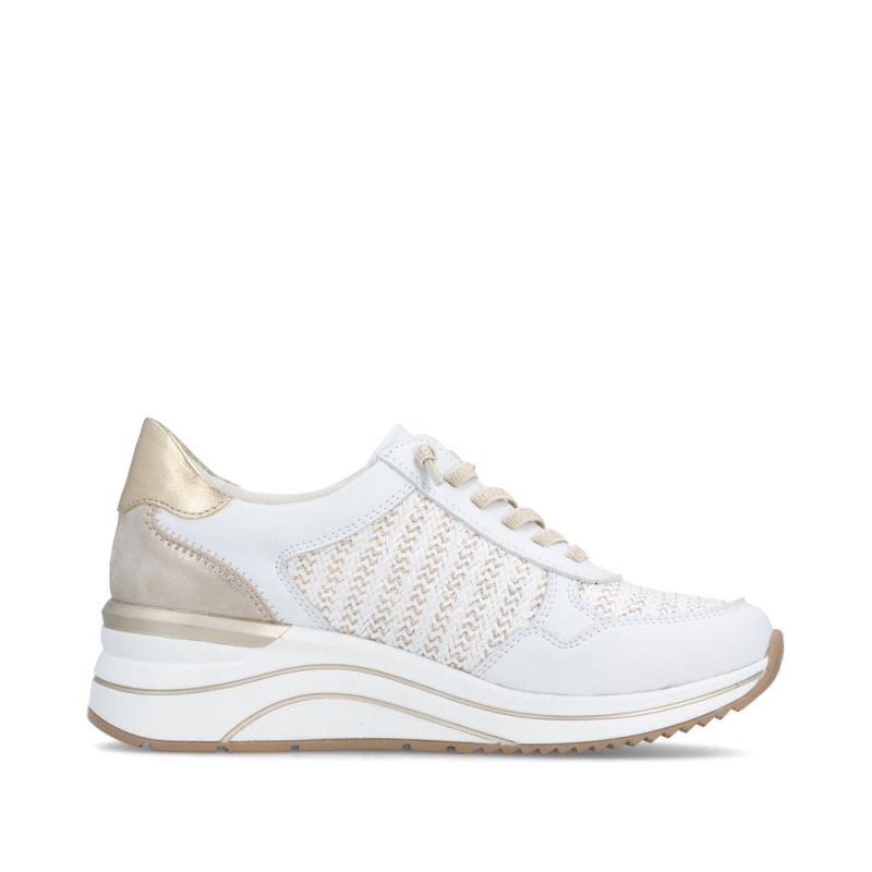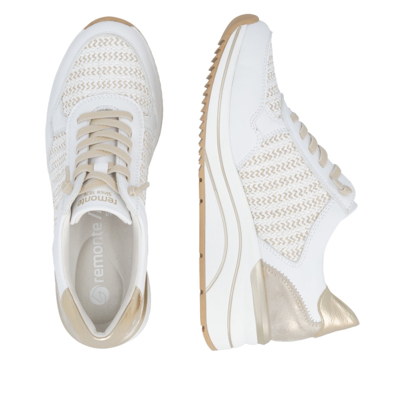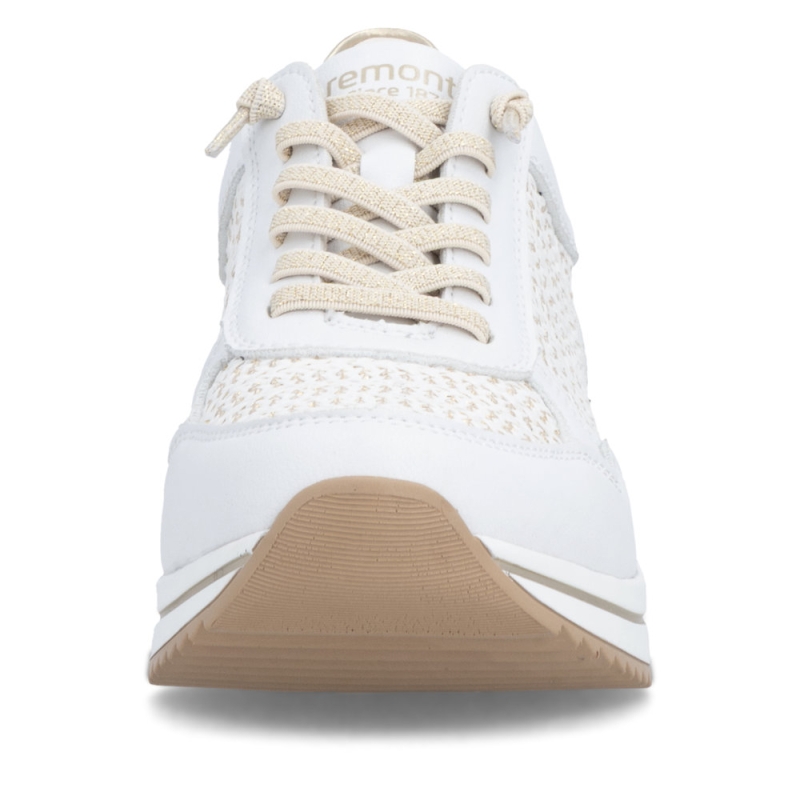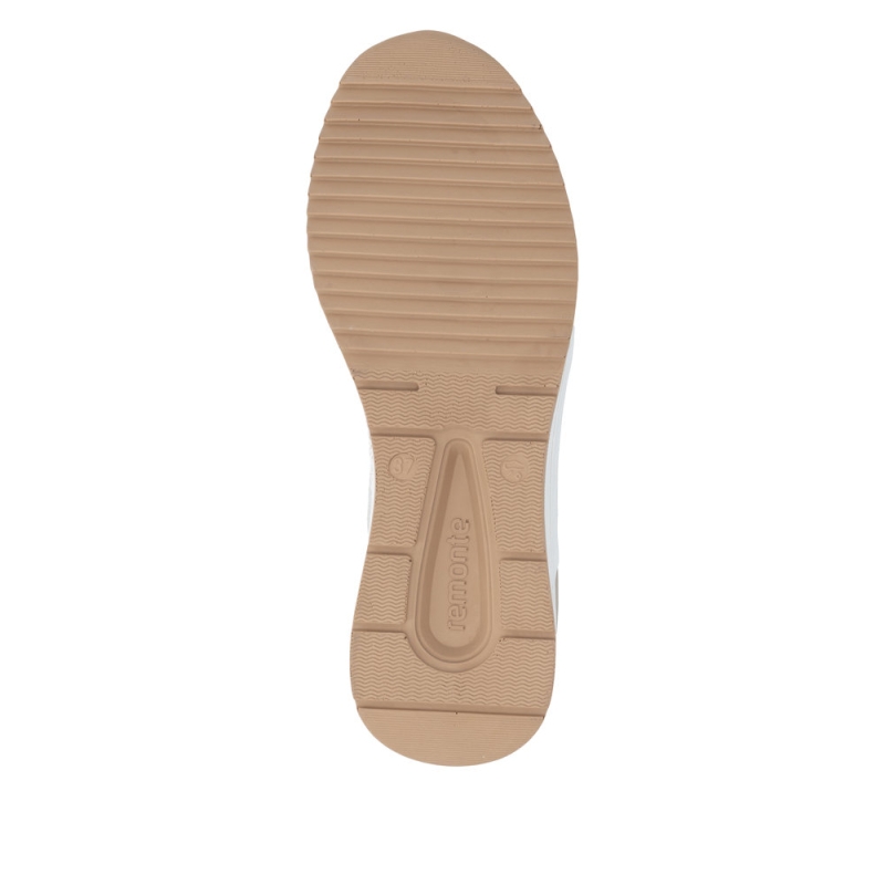Стилни бежови сникърси Remonte от естествена кожа и текстил, създадени за максимален комфорт и модерен градски стил. Анатомичната подметка и леката платформа осигуряват стабилност и удобство през целия ден. Кристалните детайли правят тези бели сникърси идеални за пролетно-летния сезон.